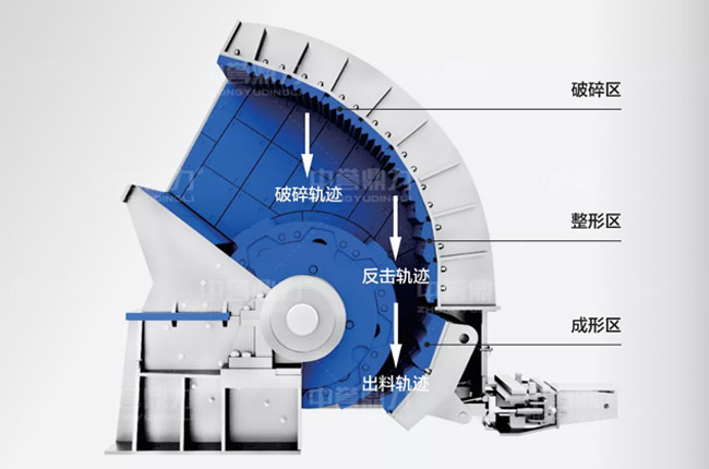錘破制砂機內(nèi)部從上到下分別是物料的破碎區(qū)、整型區(qū)、成型區(qū),其中破碎區(qū)的襯板花紋設計為波浪下行式,對物料起到整形作用,中間的整型區(qū)反擊板采用了菱形花紋設計,物料的運動軌跡在錘頭下方,有利于減少物料在機腔內(nèi)重復破碎;