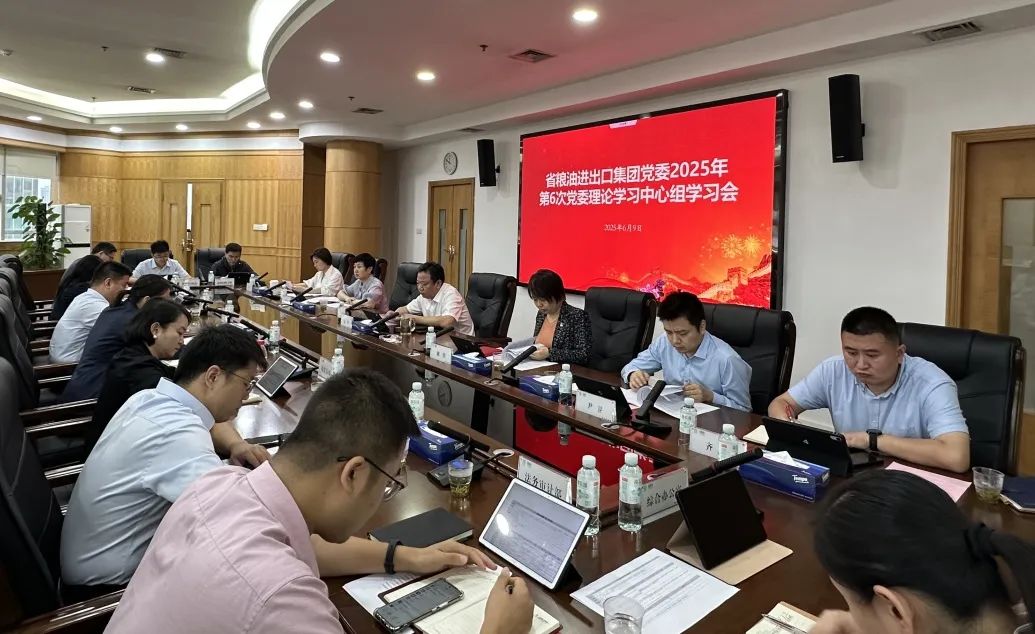 6月9日,省糧油進出口集團召開2025年第6次黨委理論學習中心組學習會,集團黨委書記、董事長孟華主持會議并講話。集團黨委班子成員、高管,各部室負責人參加會議。
