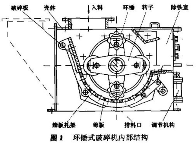 從以上KRC800環(huán)錘式破碎機(jī)結(jié)構(gòu)圖我們看到,設(shè)備的主軸上安裝有數(shù)排掛錘體,在其圓周的銷孔上貫穿著銷軸,用銷軸將錘頭鉸接在各排掛錘體之間,錘頭磨損后可調(diào)換工作面。掛錘體上開有兩個(gè)銷孔。銷孔至回轉(zhuǎn)軸心的距離是不同的,可以用來調(diào)整錘頭和篦條之間的間隙。轉(zhuǎn)子兩段支撐在滾動(dòng)軸承上,軸承有螺栓固定在機(jī)殼上。主軸和電動(dòng)機(jī)用彈性聯(lián)軸器連接。