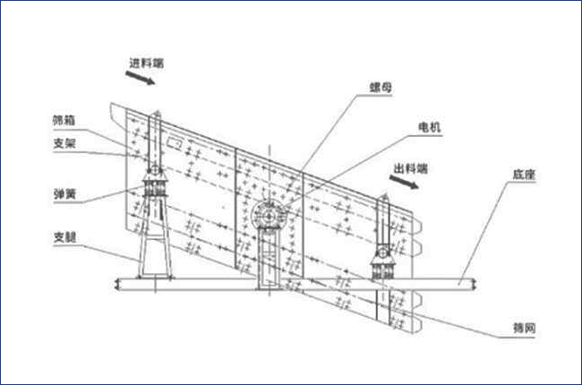 上圖為yah2460型圓振動篩結(jié)構(gòu)圖和工作示意圖,從結(jié)構(gòu)圖可以看到,該設(shè)備由箱體、支架、支腿、電機(jī)、底座、篩網(wǎng)、支腿等部分組成,篩面安裝傾角建議在20度,傾角過大物料篩分不干凈,傾角過小篩分效率過低,建議在廠家安裝人員指導(dǎo)下合理選擇。篩孔大小也可以根據(jù)要處理物料大小進(jìn)行定制。