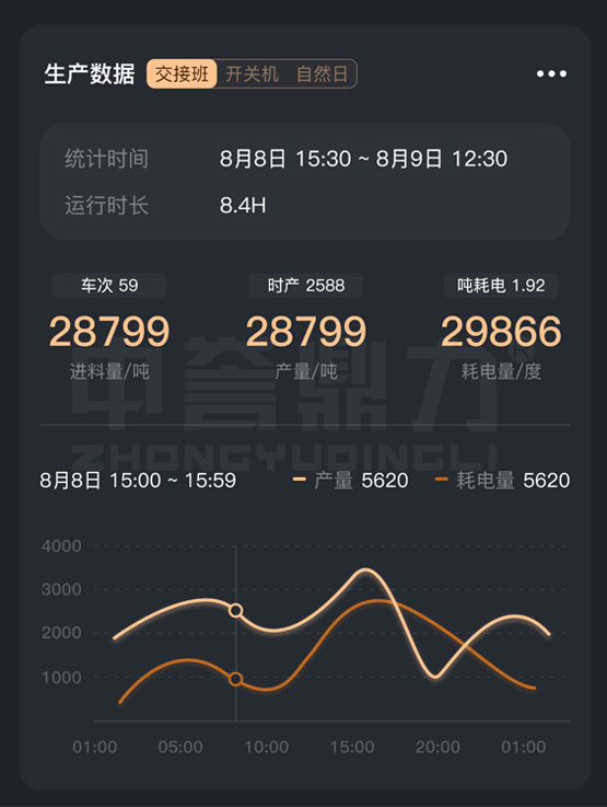 礦山管家APP可查看各類生產(chǎn)數(shù)據(jù),交接班(廠內(nèi)的上下班時間)、開關(guān)機(班次的開始結(jié)束時間)、自然日(0~24點) 進料量(數(shù)據(jù)來自進料系統(tǒng))、產(chǎn)量(數(shù)據(jù)來自皮帶秤)、耗電量(數(shù)據(jù)來自智能電表、能耗系數(shù)轉(zhuǎn)換) 產(chǎn)量耗電量趨勢對比曲線等。