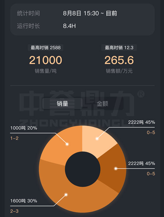 交接班(廠內(nèi)的上下班時間)、開關(guān)機(班次的開始結(jié)束時間)、自然日(0~24點) 銷量、銷售額(數(shù)據(jù)來自銷售系統(tǒng)) 各料類銷售占比餅圖,噸數(shù)、銷售額占比等各類銷售數(shù)據(jù)盤融入礦山管家APP,助力實現(xiàn)智慧礦山。