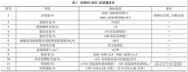 砂石骨料一般分為粗骨料和細(xì)骨料兩種,粒徑大于5mm的為粗骨料,小于5mm的為細(xì)骨料。粗骨料按粒徑80~150mm為特大石,40~80mm為大石,20~40mm為中石,5~20mm為細(xì)石;細(xì)骨料分為粗砂、中砂和細(xì)砂。骨料質(zhì)量管理主要控制粗骨料的遜徑和細(xì)骨料的石粉含量及細(xì)度模數(shù),混凝土用砂石骨料加工,質(zhì)量要求詳見(jiàn)下表。