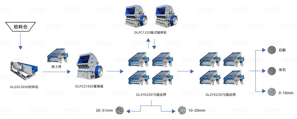 原料倉(cāng)+ZGC2050振動(dòng)給料機(jī)+PE1500×1800顎式破碎機(jī)+PF1820反擊式破碎機(jī)*2臺(tái)+2YK3072振動(dòng)篩*4臺(tái)。