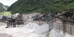 石料生產(chǎn)線在工作過程中,大塊石料經(jīng)料倉由振動(dòng)給料機(jī)均勻地送進(jìn)重型錘式破碎機(jī)進(jìn)行粗碎,粗碎后的石料由皮帶輸送機(jī)送入錘式破碎機(jī)(或反擊式破碎機(jī))進(jìn)行中碎,中碎后的石料由膠帶輸送機(jī)送進(jìn)振動(dòng)篩進(jìn)行篩分,符合規(guī)格的石料和成品砂子(篩下物)由膠帶輸送機(jī)送至成品料堆;不符合規(guī)格的大顆粒石料(篩上物)由皮帶輸送機(jī)返回至錘式破碎機(jī)再次進(jìn)行破碎處理,破碎后的石料再經(jīng)過膠帶輸送機(jī)送進(jìn)振動(dòng)篩進(jìn)行篩分,這樣形成閉路多次循環(huán)。