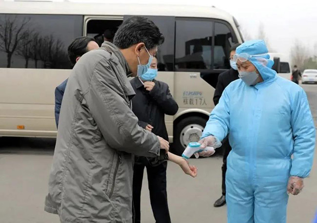 體溫檢測后進入中譽鼎力智能裝備公司廠區(qū)