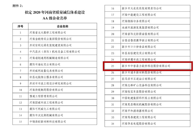 近日,新鄉(xiāng)市中譽鼎力軟件科技股份有限公司通過初審、用戶滿意度調(diào)查、評估等程序,成功入選“2020年河南省質(zhì)量誠信體系建設(shè)AA級企業(yè)”名單。