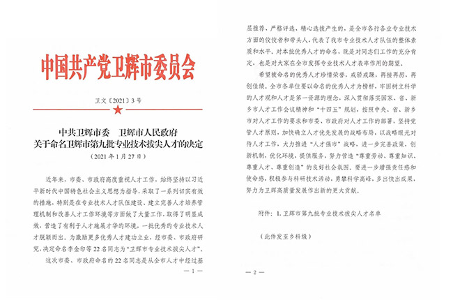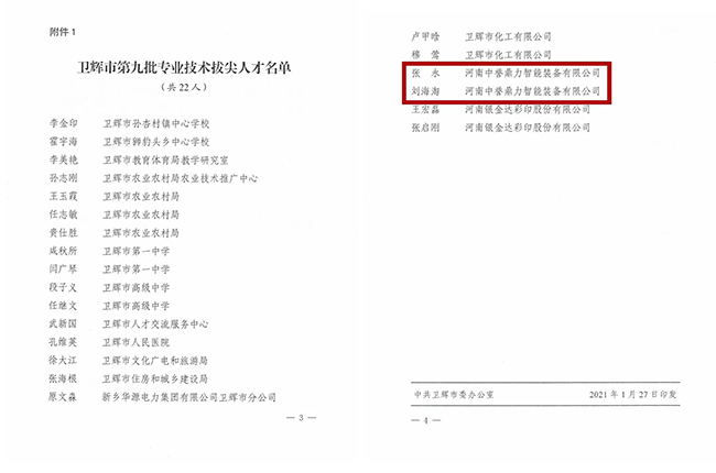 2021年1月27日,衛(wèi)輝市委、市發(fā)布《關(guān)于命名衛(wèi)輝市第九批技術(shù)拔尖人才的決定》。中譽鼎力董事長張永、河南中譽鼎力智能裝備有限公司技術(shù)中心部長劉海淘被任命為“衛(wèi)輝市技術(shù)拔尖人才”!