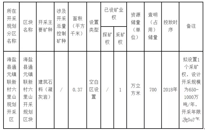 擬在規(guī)劃禁采區(qū)(CJ330400001)內(nèi)新劃定規(guī)劃開(kāi)采區(qū)一個(gè),并設(shè)置開(kāi)采規(guī)劃區(qū)塊1個(gè),區(qū)塊內(nèi)設(shè)置“海鹽縣通元鎮(zhèn)聯(lián)新村六里山普通建筑石料礦”采礦權(quán)1宗。
