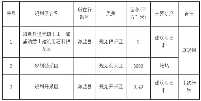 一、新增“海鹽縣通元鎮(zhèn)聯(lián)新村六里山建筑用石料規(guī)劃開(kāi)采區(qū)(KC1)”