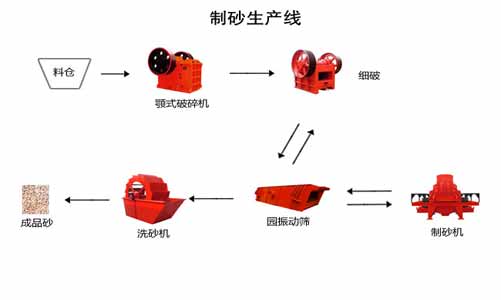 一般制砂生產(chǎn)線由破碎制砂設(shè)備和輔助設(shè)備共同構(gòu)成,其中破碎制砂設(shè)備根據(jù)流程依次為:顎式破碎機(jī)(粗破)、圓錐式破碎機(jī)/反擊式破碎機(jī)(細(xì)破)、制砂機(jī) ,分三個(gè)破碎等級(jí)對(duì)物料進(jìn)行加工處理。輔助設(shè)備一般有:給料倉(cāng)、振動(dòng)給料機(jī)、傳輸皮帶機(jī)、振動(dòng)篩、洗砂機(jī)。