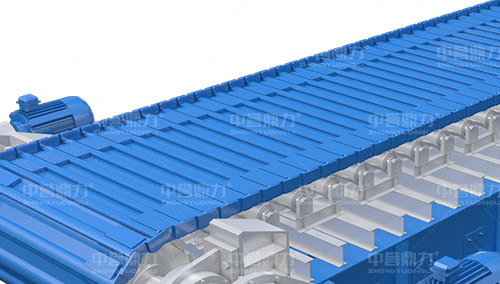 右側(cè)為中譽(yù)鼎力重型板式給料機(jī)結(jié)構(gòu)圖,該設(shè)備主要由鏈板裝置、拉緊裝置、驅(qū)動(dòng)裝置和主軸裝置等部分組成。