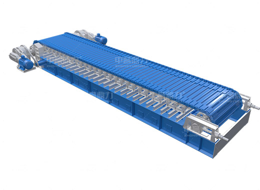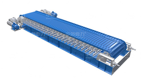 電動(dòng)機(jī)轉(zhuǎn)動(dòng),通過(guò)傳動(dòng)軸和驅(qū)動(dòng)裝置,帶動(dòng)主軸旋轉(zhuǎn),鏈輪和鏈條安裝在主軸裝置上,通過(guò)該裝置帶動(dòng)鏈條上的鏈板做直線運(yùn)動(dòng),鏈條上安裝有承料槽板,鏈板的直線運(yùn)動(dòng)將物料均勻的帶到鏈條的槽板上,并向前輸送,達(dá)到輸送物料的目的。