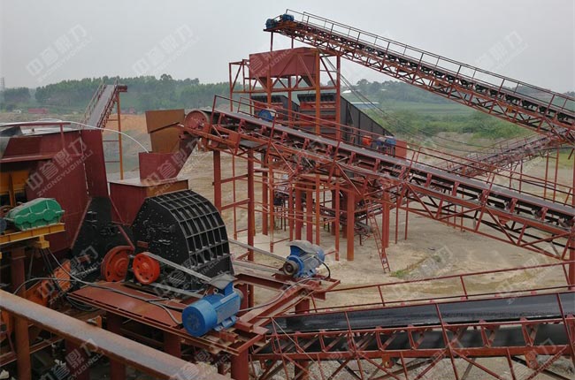 二、粗破后的物料由膠帶輸送機(jī)送入到二破(XPC1216錘式破碎機(jī))進(jìn)行細(xì)碎