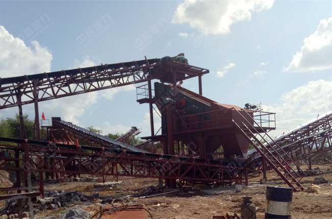 石料由ZGC1038振動(dòng)給料機(jī)均勻地送到頭破(PCZ1510重型錘式反擊破碎機(jī))進(jìn)行粗破,粗破后的物料由膠帶輸送機(jī)送入到二破(XPC0808錘式破碎機(jī))進(jìn)行細(xì)碎,細(xì)碎后的物料被輸送到一組并篩2YKQ2060振動(dòng)篩進(jìn)行篩分,篩分出1-3、1-2、0-5和石粉四中成品料,由輸送帶送到成品料堆。成品粒度可按用戶的需求進(jìn)行組合和分級(jí)。