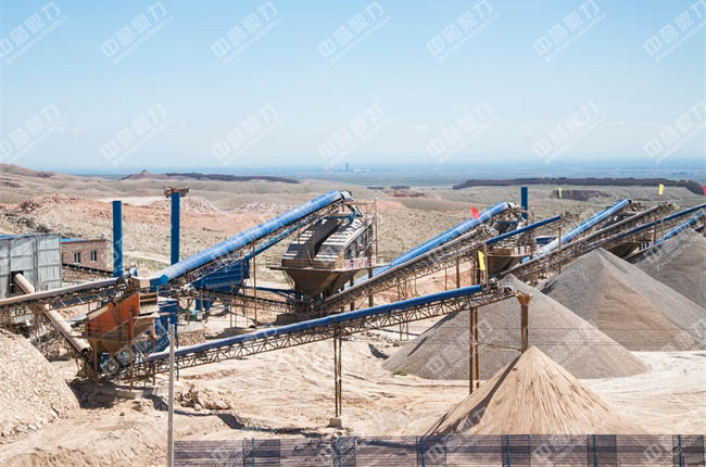 大塊石料經(jīng)ZGC1538振動給料機均勻、連續(xù)的送進頭破PCZ1615重型錘式反擊破碎機進行粗破,破碎后的物料由皮帶輸送機送至一道并篩3YKZ3070振動篩進行篩分,篩分出來的大塊物料被一條輸送帶送到二破XPC1220錘式破碎機進行進一步破碎,與頭破出來的另一部分料一起被主輸送帶送至道并篩3YKZ2460和第三道并篩2YKZ2460進行篩分,篩分出幾種不同規(guī)格的成品料被輸送帶送到成品料堆。