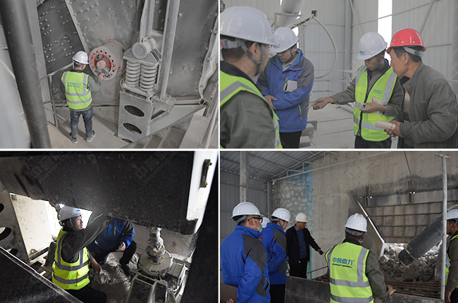 在現(xiàn)場(chǎng),售后服務(wù)團(tuán)隊(duì)各司其責(zé),分別對(duì)這條時(shí)產(chǎn)1500噸砂石生產(chǎn)線的給料機(jī)、破碎機(jī)、制砂機(jī)、振動(dòng)篩、減速機(jī)、輸送設(shè)備、散裝機(jī)、除塵設(shè)備、拉鏈機(jī)、電氣設(shè)備等進(jìn)行細(xì)致檢查,并做詳細(xì)記錄。同時(shí)也向項(xiàng)目相關(guān)負(fù)責(zé)人就設(shè)備的日常使用保養(yǎng)、注意事項(xiàng)提出了建議。