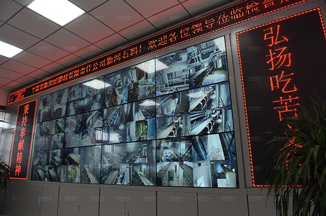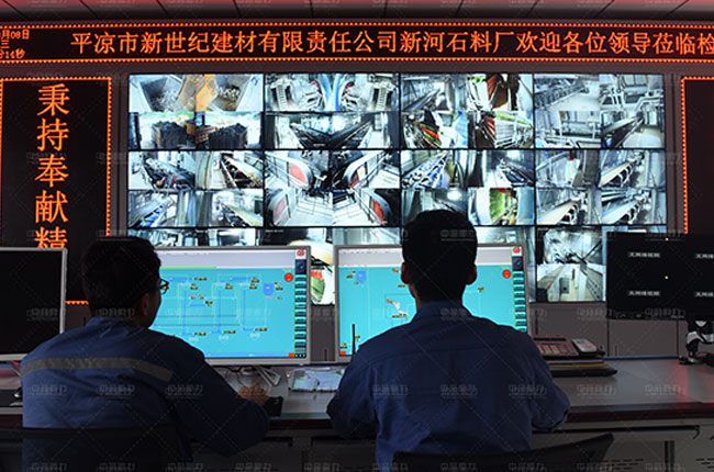 石料廠總控制室,從監(jiān)控可清楚的看到生產線各設備的運行情況